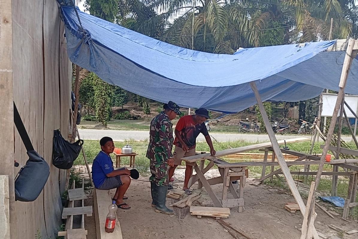Dalam pelaksanaannya, Babinsa turun langsung ke lapangan dengan menyambangi lokasi aktivitas warga. Terlihat Sertu Erpan berbincang akrab dengan masyarakat yang tengah bekerja di area pembangunan, sembari menanyakan kondisi serta kendala yang dihadapi. Suasana interaksi yang hangat dan santai mencerminkan hubungan harmonis antara aparat dan warga.